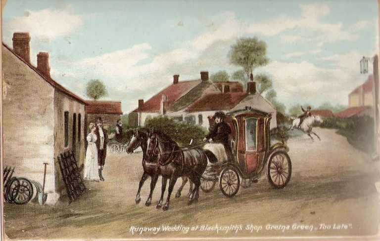 Gretna Green’s Blacksmiths’ Old Smithy became the famed destination for eloping couples. There, the Blacksmith would perform the ceremony over the anvil. He would ask two simple questions: “Are you free to marry?” and “Are you of marriageable age?” Once both parties replied “yes,” the Blacksmith would strike the anvil with his hammer and declare them “man and wife.”
